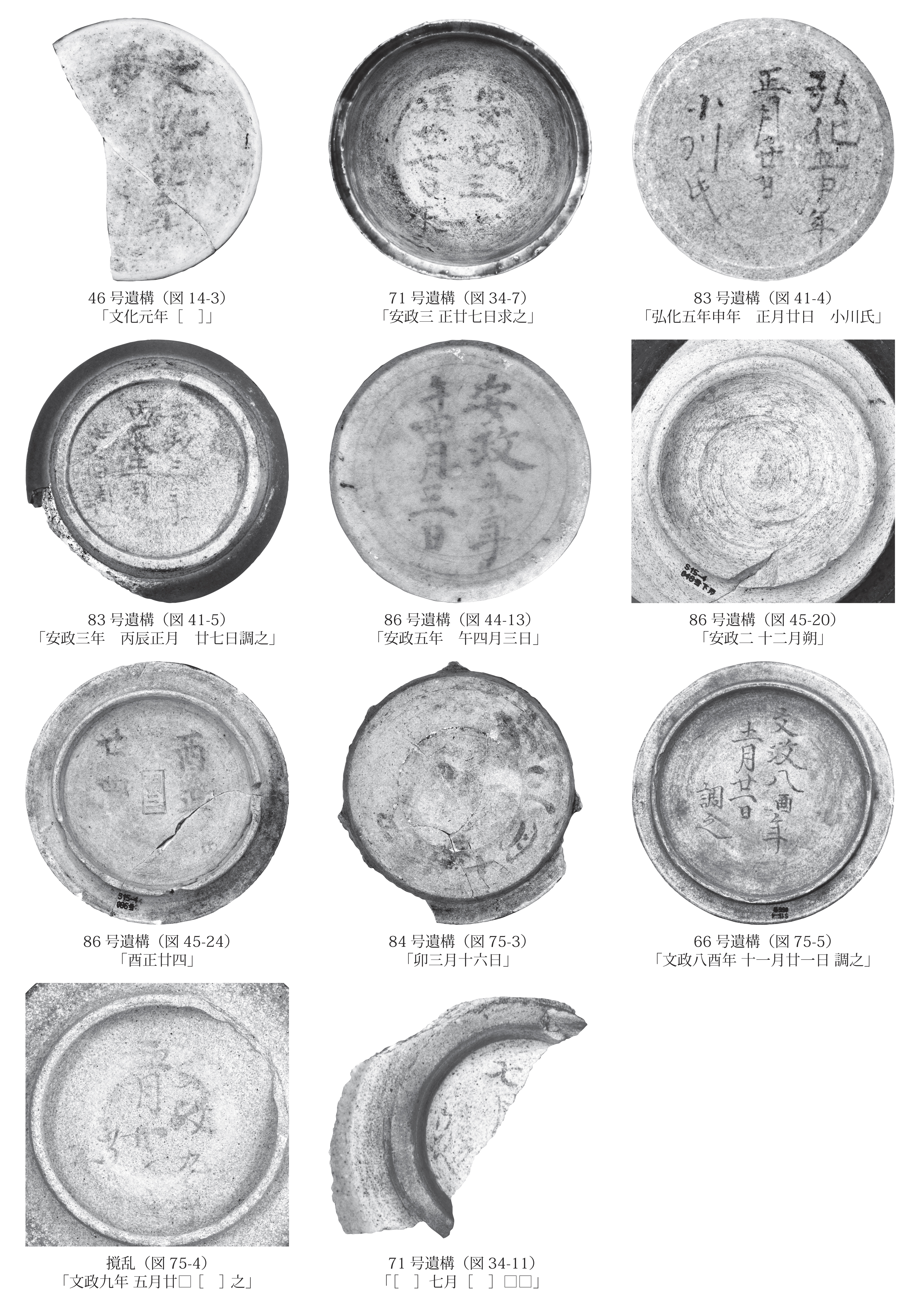 | 概要 | 市谷甲良町遺跡は、市谷甲良町、市谷山伏町、南山伏町、二十騎町にまたがる、縄文時代、江戸時代を中心とする遺跡である。 5次調査(市谷甲良町11)は、平成25(2013)年7月から9月にかけて実施された。この場所は、17世紀中頃には江戸幕府の留守居組、その後二之丸同心、書院番等の組屋敷として利用される。発掘調査では、これらの屋敷地に居住した御家人の生活を物語る遺構・遺物が発見されている。注目されるのは、燗徳利の底や土瓶の蓋等に年号を墨で書いたものが全部で11点も出土した点である。年号は、文化元(1804)年から安政5(1858)年までの約半世紀の間に集中している。字配りや筆跡はどれも似ていることから、同一人物の手によるものと推定される。当時の屋敷拝領者は禄高228俵の旗本篠本彦次郎で、奥右筆組頭手附出役を皮切りに勘定支配、甲斐、越後、常陸、下総の代官を歴任した。多くの陶磁器に文字を記したマメな人物、それは屋敷の主、彦次郎自身であったと考えられる。 |