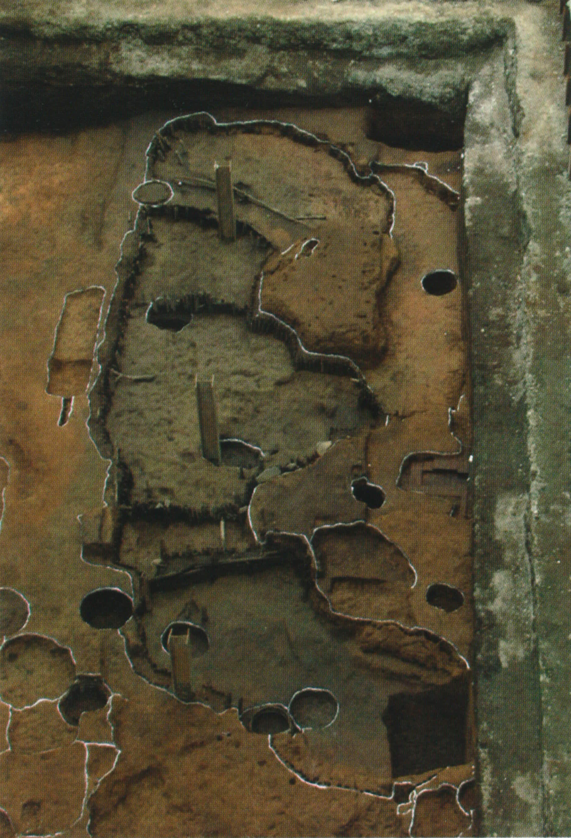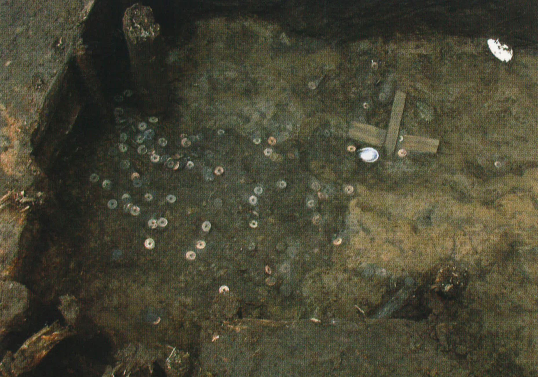 | 概要 | 天龍寺遺跡は、新宿四丁目一帯に広がる徳川家ゆかりの寺院、曹洞宗天龍寺に関わる江戸時代の遺跡である。 同寺は、江戸時代の初め、遠江国から牛込に転入するが、天和3(1683)年の大火により類焼し、この地に移される。 平成14(2002)年4月から5月にかけて行われた1次調査は、境内の北東部にあたり、東西19.5m、南北8.5m以上の池跡や植栽痕、ごみ穴等が検出された。これらの遺構から出土した薄茶碗の高台(裏面)内には、墨で「方」、「茶」等の文字が記されていた。これらは、「方丈」、「茶堂」を表すと考えられる。その他に「月」、「首」、「什」等の文字があり、僧侶の生活と関係する建物もしくは部屋を指すと考えられる。 |